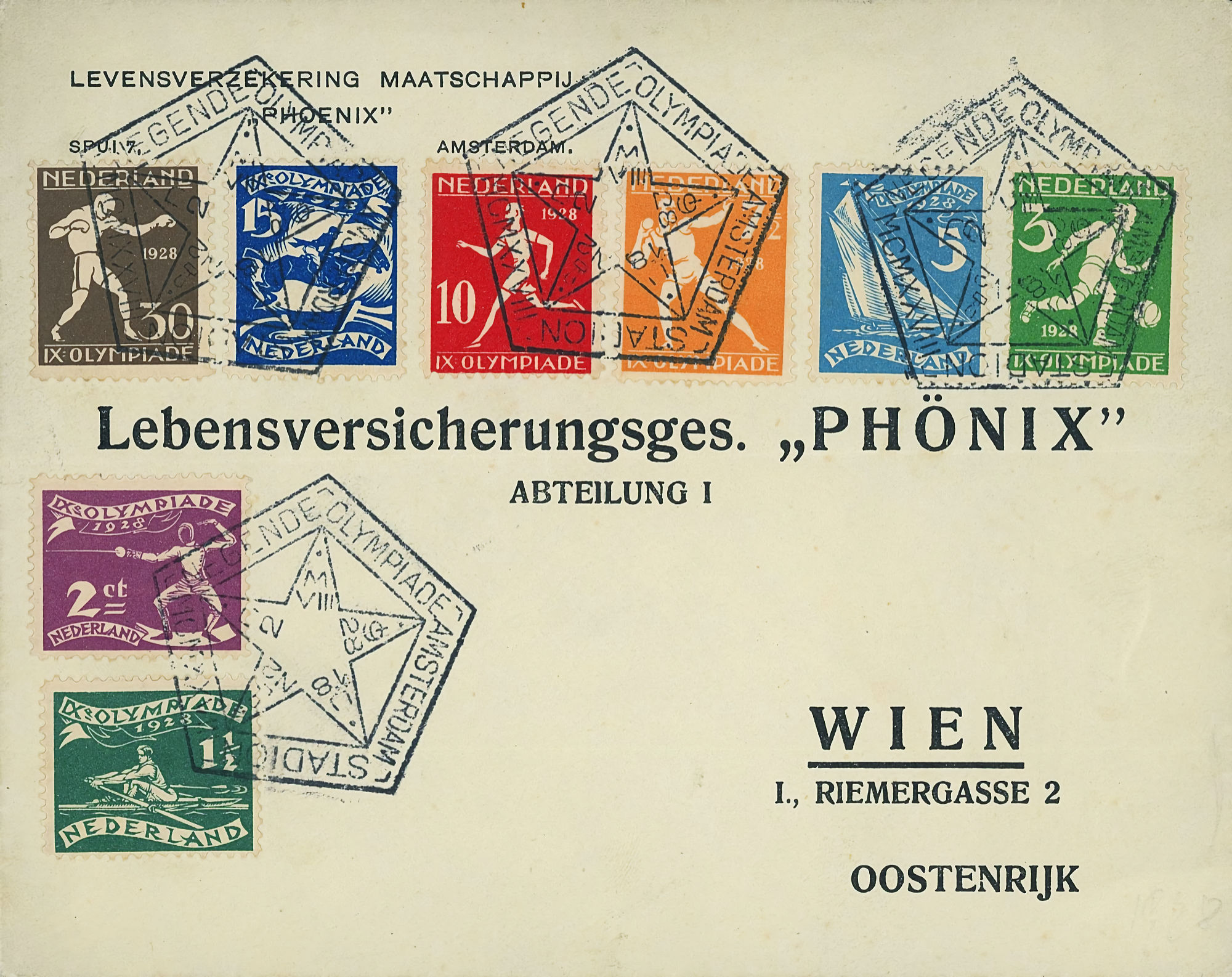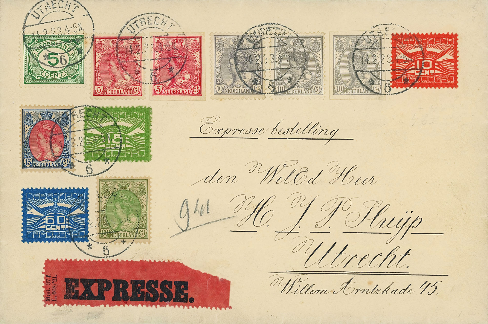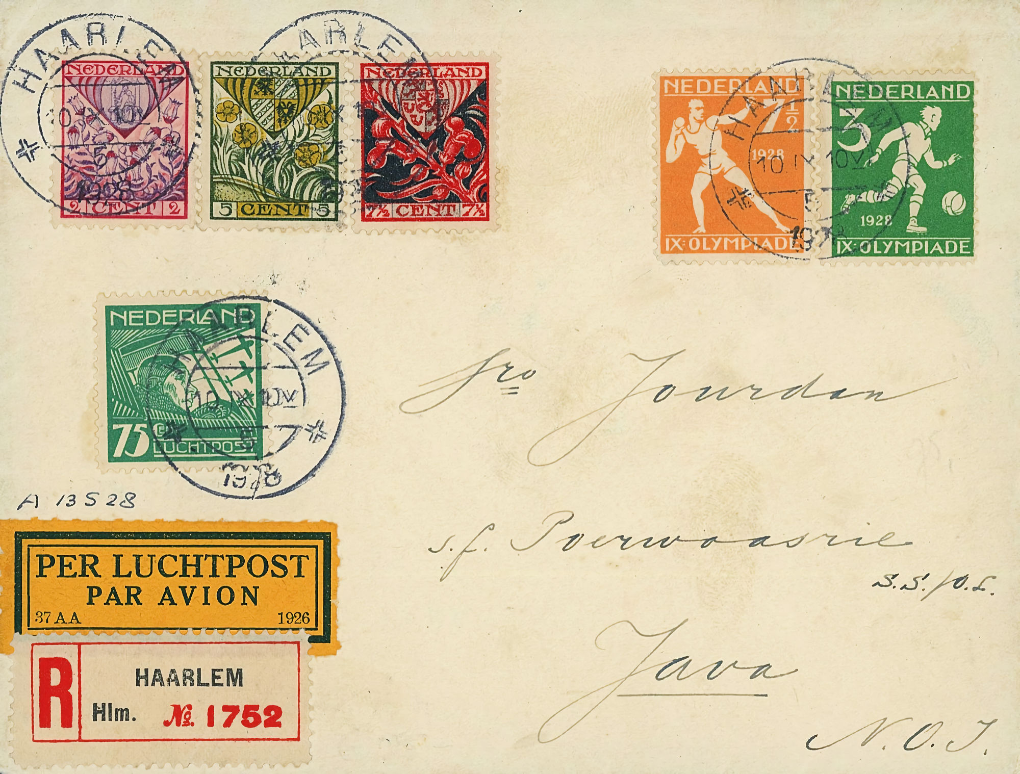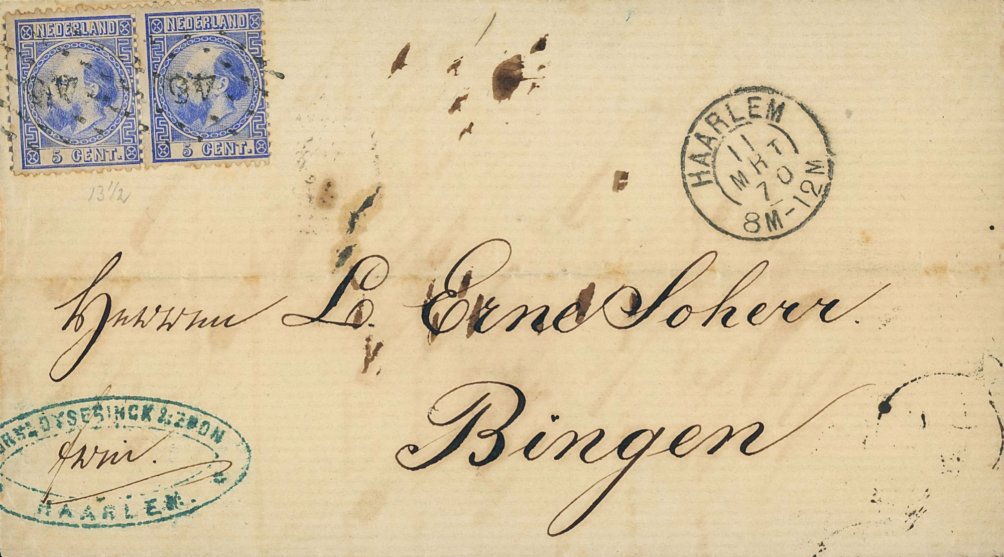 1864 NVPH 1 vertical pair on letter Haarlem - Groningen 1868 NVPH 6 (15 cents) on folded letter Rotterdam - London - Belfast 1870, cover to Bingen (Germany), Haarlem cancel 1874 letter 's Gravesande - St Geertruid 1876 Aangetekend Utrecht - Herwijnen 1892 Puntstempel 16 Breda mengfrankering naar Parijs 1894 Zaandam upr. Stationery Cover to Denmark 1904 Cover with large round stamp Rotterdam - England 1916 Insured cover to Germany, censored, arr. canc. 1922 Large cover to Germany nice franking 1922 Airmail to London + stamp shifted print + cert. 1923 express letter Utrecht with LP 1-3 1924 Letter to England with many Wilhelmina stamps 1924 New Year's Envelope with stamp Hengelo(ov) to Zeist 1928 Olympics complete set cover with stadium cancel 1928 R lp letter Haarlem - Poerwoasri, Dut. Indies 1928 Reg cover to Sweden f/vf 1929 Airmail to Switzerland with 1½ and 4½ gulden 1932 Cover with short bar stamp Zaltbommel - Soerabaja A.N.V.V. and children's stamps 1933 Company cover with short bar stamp Haarlem - Belgium blockspostcards