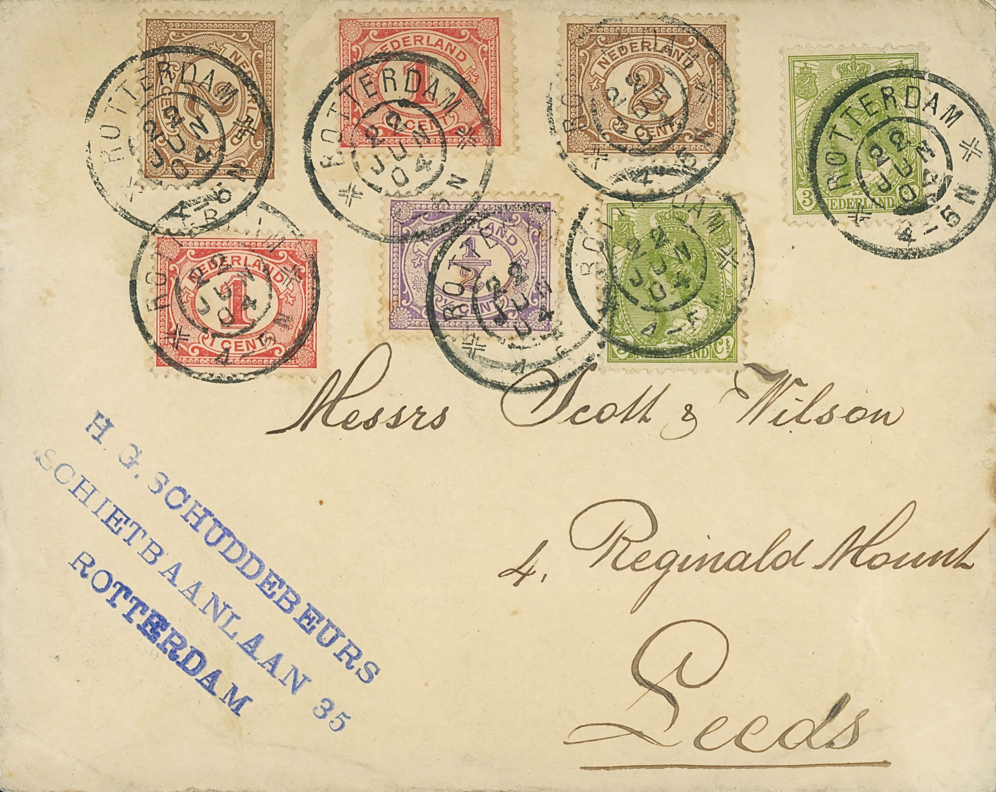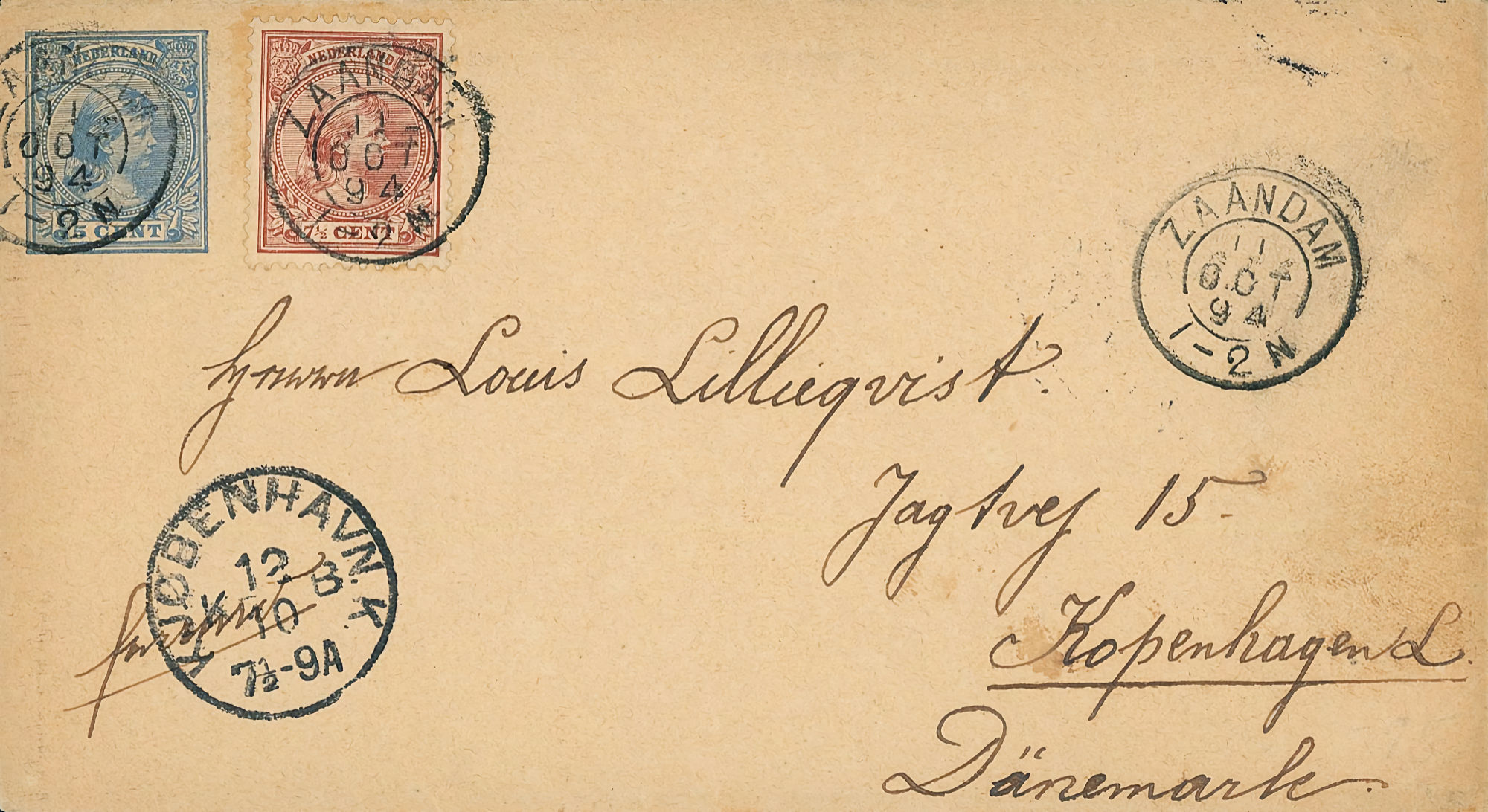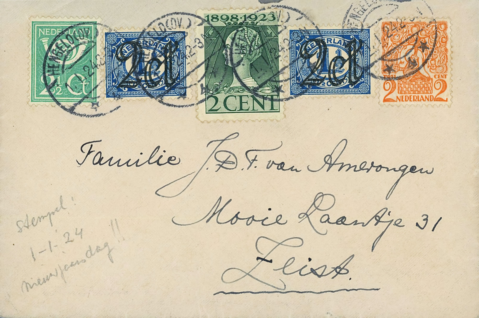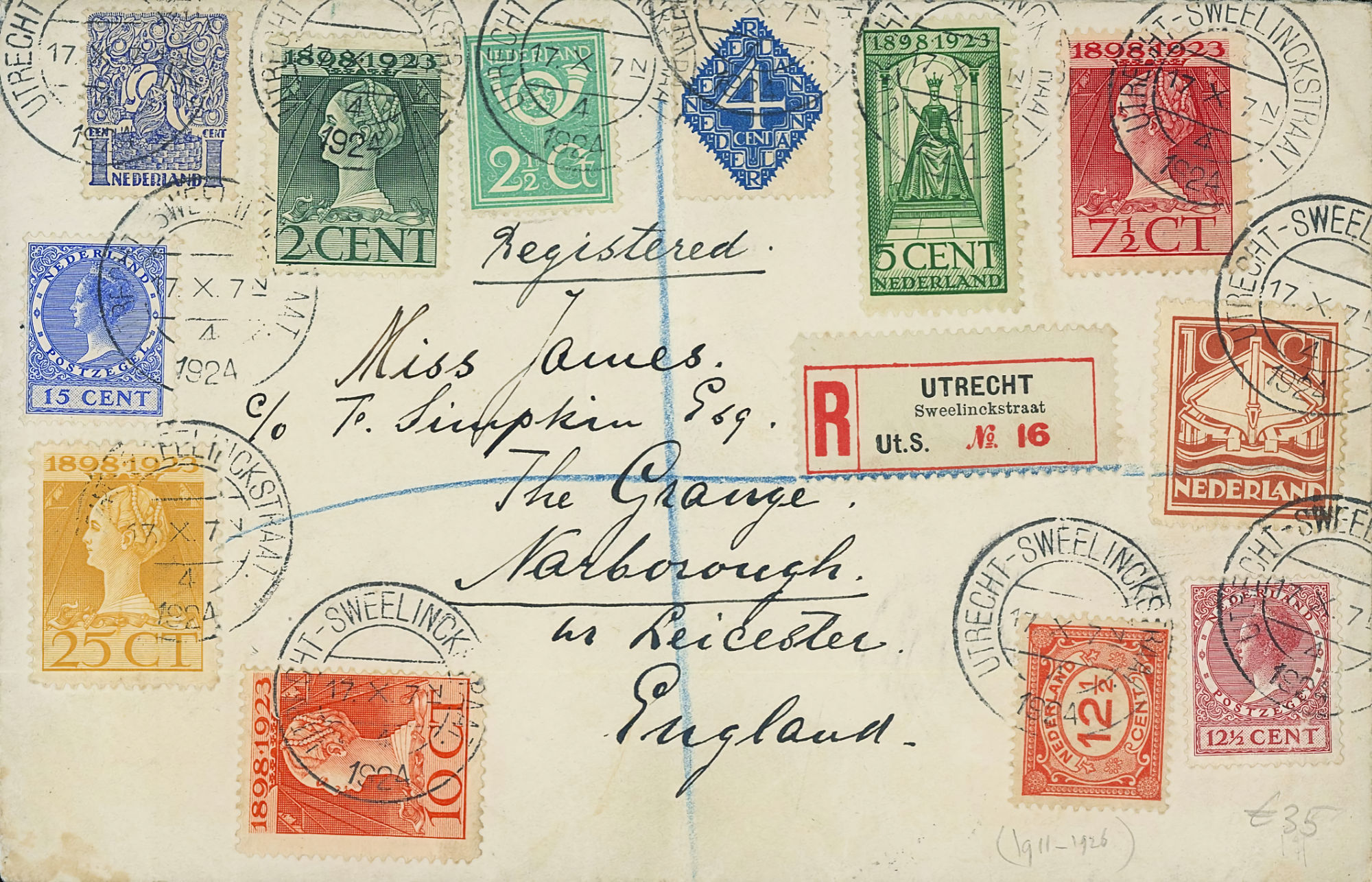 1864 NVPH 1 vertical pair on letter Haarlem - Groningen 1868 NVPH 6 (15 cents) on folded letter Rotterdam - London - Belfast 1870, cover to Bingen (Germany), Haarlem cancel 1874 letter 's Gravesande - St Geertruid 1876 Aangetekend Utrecht - Herwijnen 1892 Puntstempel 16 Breda mengfrankering naar Parijs 1894 Zaandam upr. Stationery Cover to Denmark 1904 Cover with large round stamp Rotterdam - England 1916 Insured cover to Germany, censored, arr. canc. 1922 Large cover to Germany nice franking 1922 Airmail to London + stamp shifted print + cert. 1923 express letter Utrecht with LP 1-3 1924 Letter to England with many Wilhelmina stamps 1924 New Year's Envelope with stamp Hengelo(ov) to Zeist 1928 Olympics complete set cover with stadium cancel 1928 R lp letter Haarlem - Poerwoasri, Dut. Indies 1928 Reg cover to Sweden f/vf 1929 Airmail to Switzerland with 1½ and 4½ gulden 1932 Cover with short bar stamp Zaltbommel - Soerabaja A.N.V.V. and children's stamps 1933 Company cover with short bar stamp Haarlem - Belgium blockspostcards