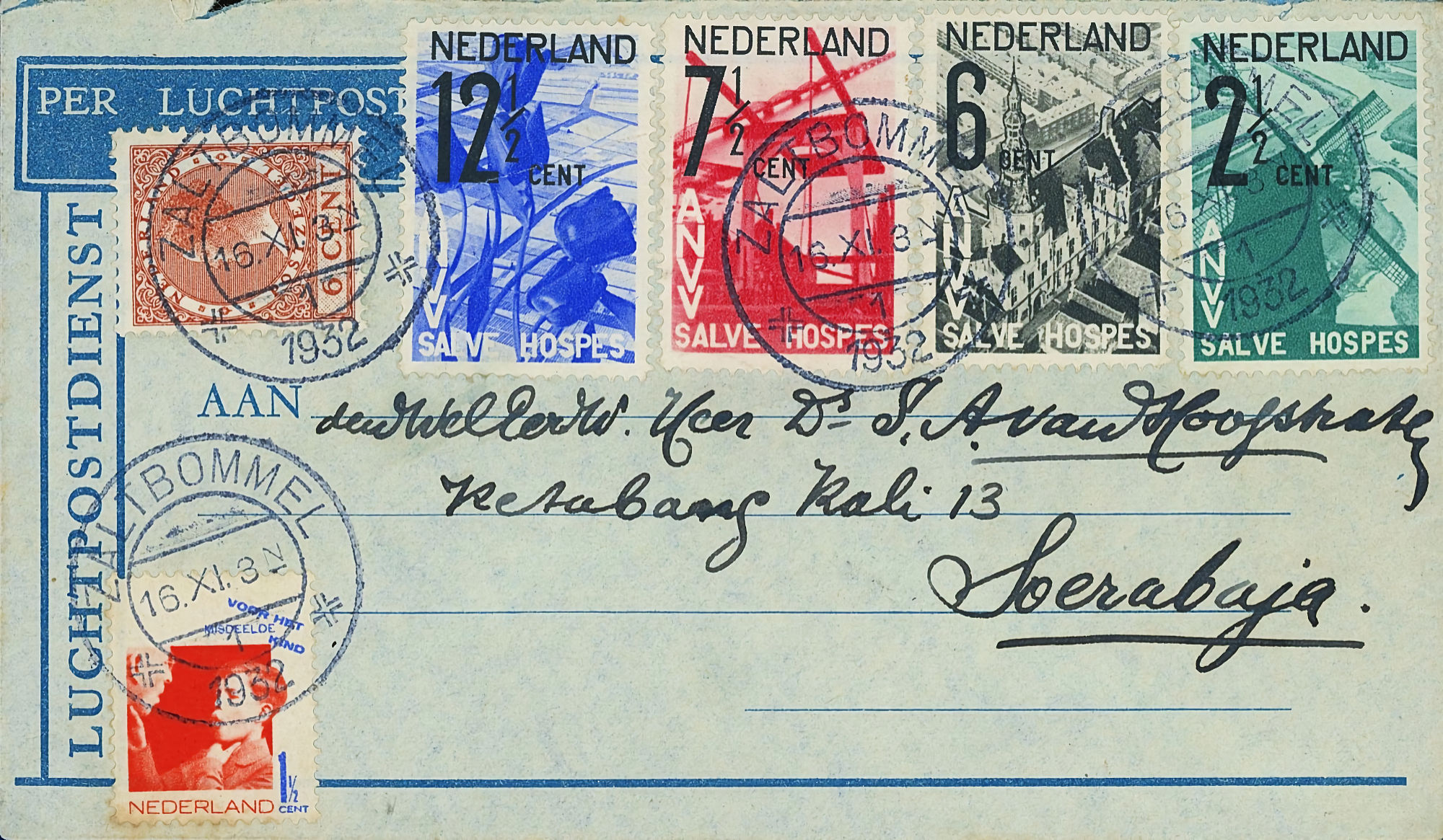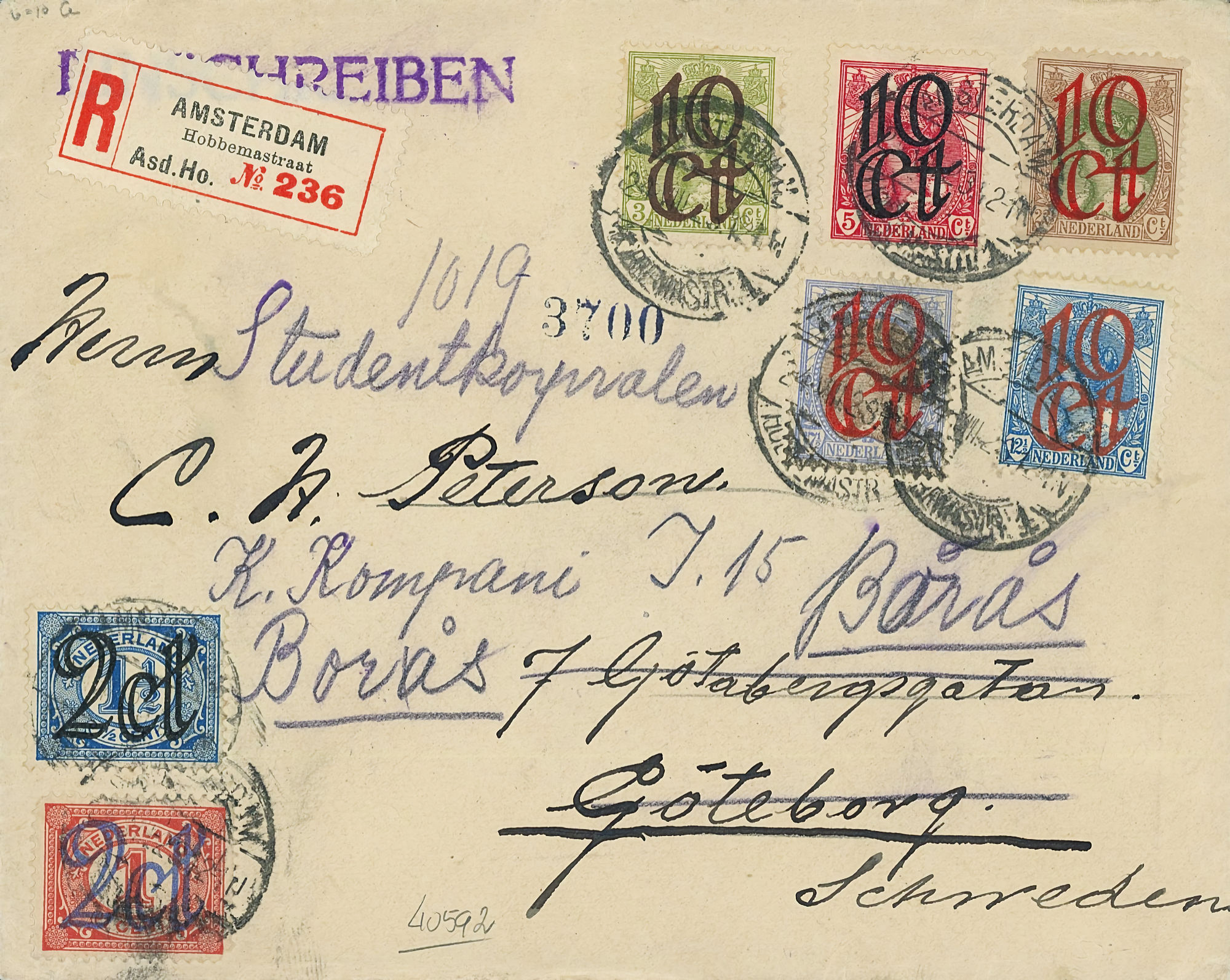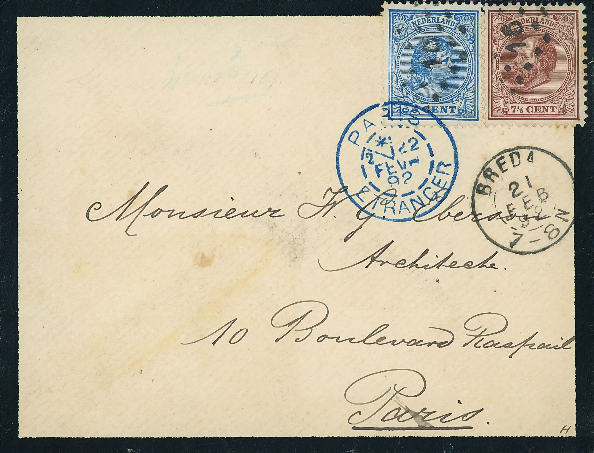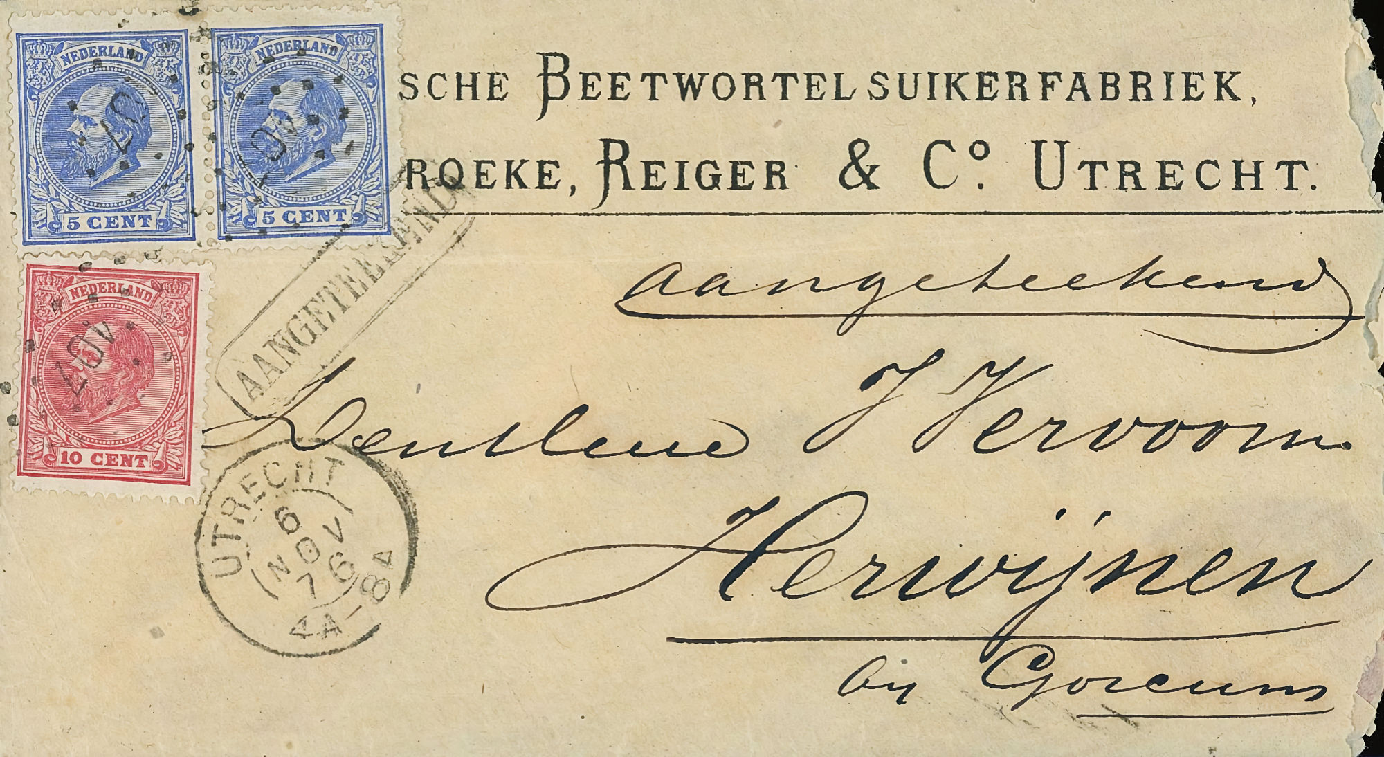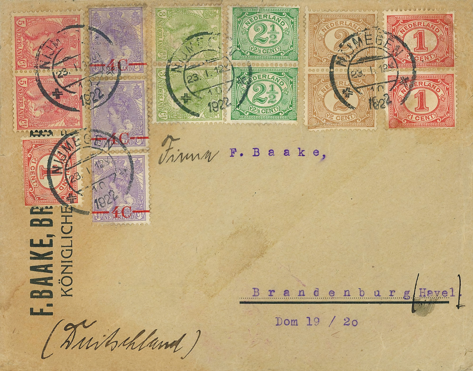 1864 NVPH 1 vertical pair on letter Haarlem - Groningen 1868 NVPH 6 (15 cents) on folded letter Rotterdam - London - Belfast 1870, cover to Bingen (Germany), Haarlem cancel 1874 letter 's Gravesande - St Geertruid 1876 Aangetekend Utrecht - Herwijnen 1892 Puntstempel 16 Breda mengfrankering naar Parijs 1894 Zaandam upr. Stationery Cover to Denmark 1904 Cover with large round stamp Rotterdam - England 1916 Insured cover to Germany, censored, arr. canc. 1922 Large cover to Germany nice franking 1922 Airmail to London + stamp shifted print + cert. 1923 express letter Utrecht with LP 1-3 1924 Letter to England with many Wilhelmina stamps 1924 New Year's Envelope with stamp Hengelo(ov) to Zeist 1928 Olympics complete set cover with stadium cancel 1928 R lp letter Haarlem - Poerwoasri, Dut. Indies 1928 Reg cover to Sweden f/vf 1929 Airmail to Switzerland with 1½ and 4½ gulden 1932 Cover with short bar stamp Zaltbommel - Soerabaja A.N.V.V. and children's stamps 1933 Company cover with short bar stamp Haarlem - Belgium blockspostcards